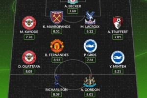 WhoScored英超第30轮最佳阵容:B费、戈登、里沙利松、阿利松在列