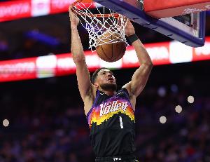 布克第三节手感火热,单节8中6砍下16分,本场已经19中13得到35分3篮板5助攻。